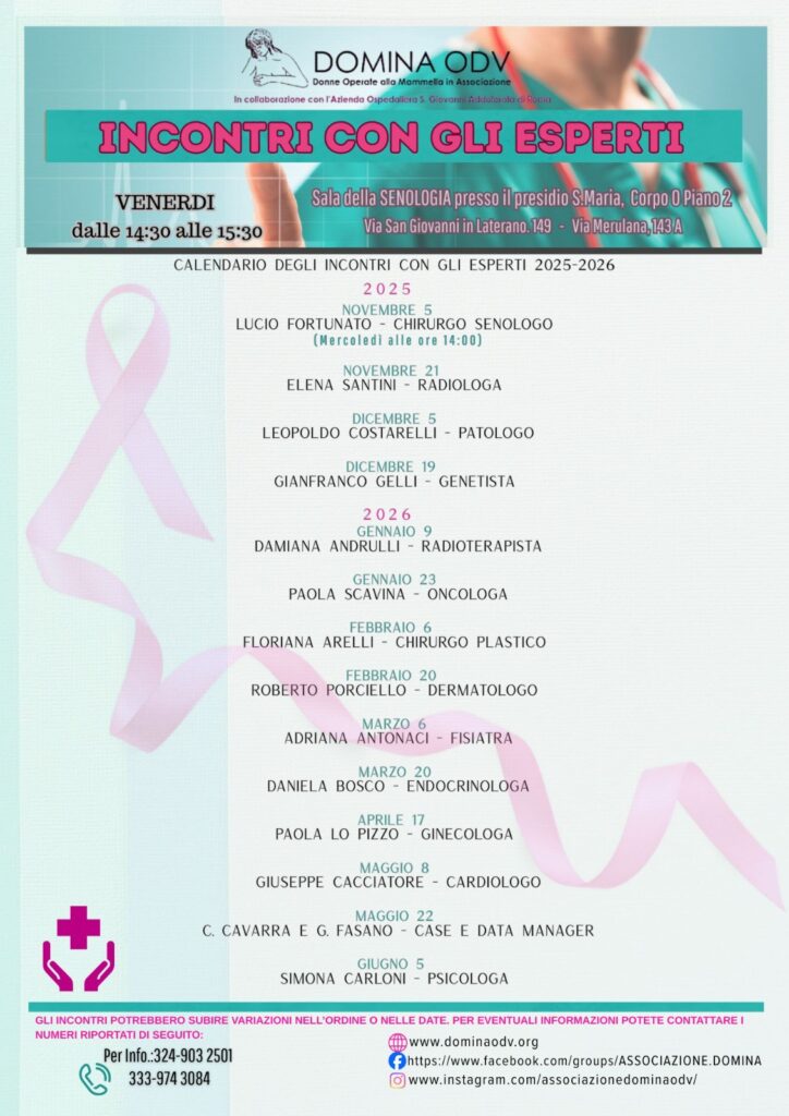Per questo, come ogni anno, la Domina promuove l’iniziativa di un corso semestrale con un incontro ogni 15 giorni, tenuto dagli specialisti che si occupano della patologia provenienti dalla Breast Unit dell’Azienda S.Giovanni-Addolorata, dove l’Associazione ha la sua sede.